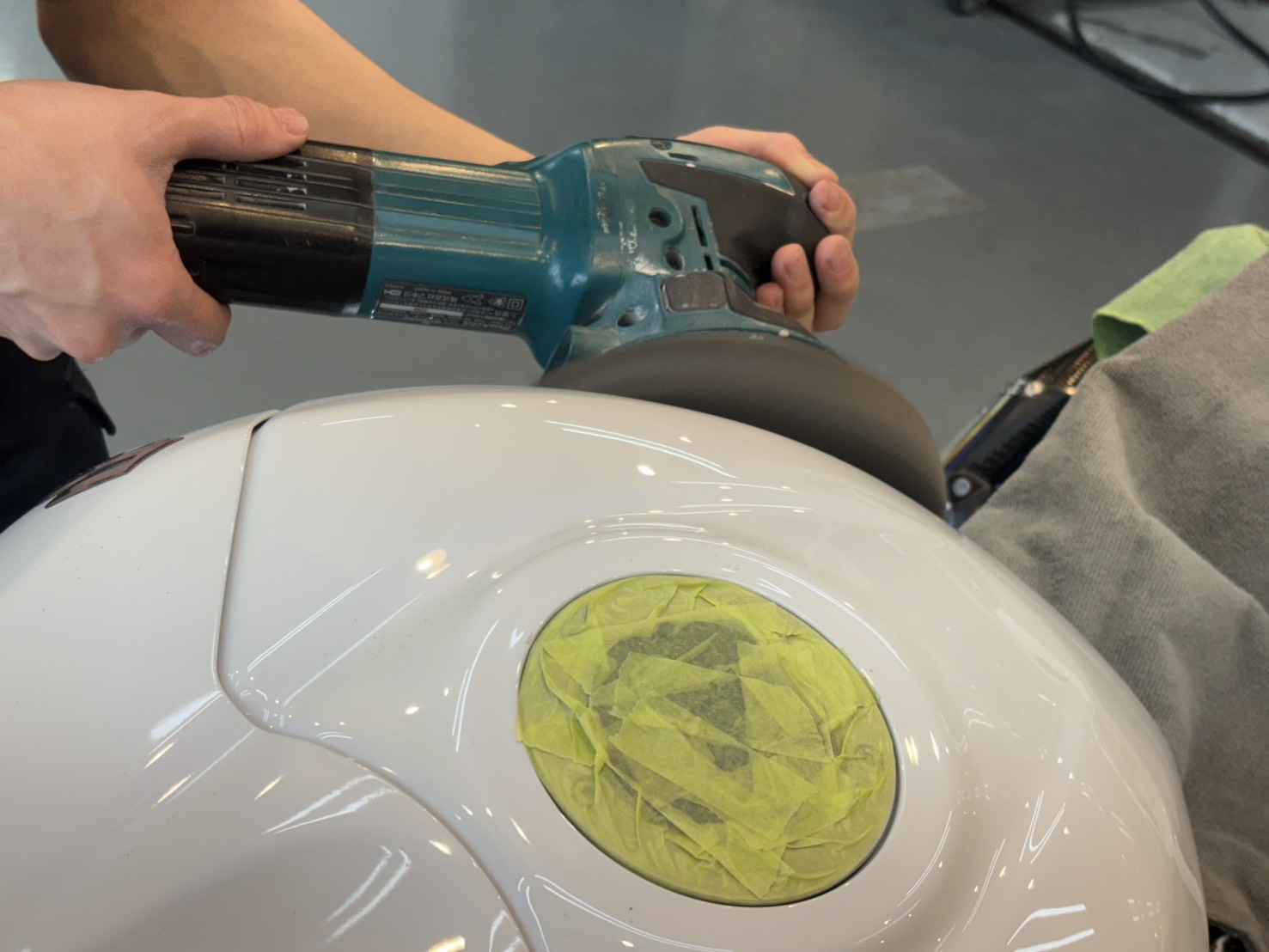 下地洗車後にコーティング施工前の研磨作業を行います。