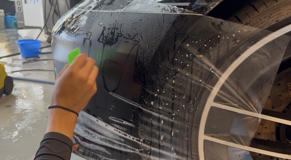 大きめに切り出したPPFを載せ、スキージングにより塗膜と密着させながら施工液を抜いていきます。