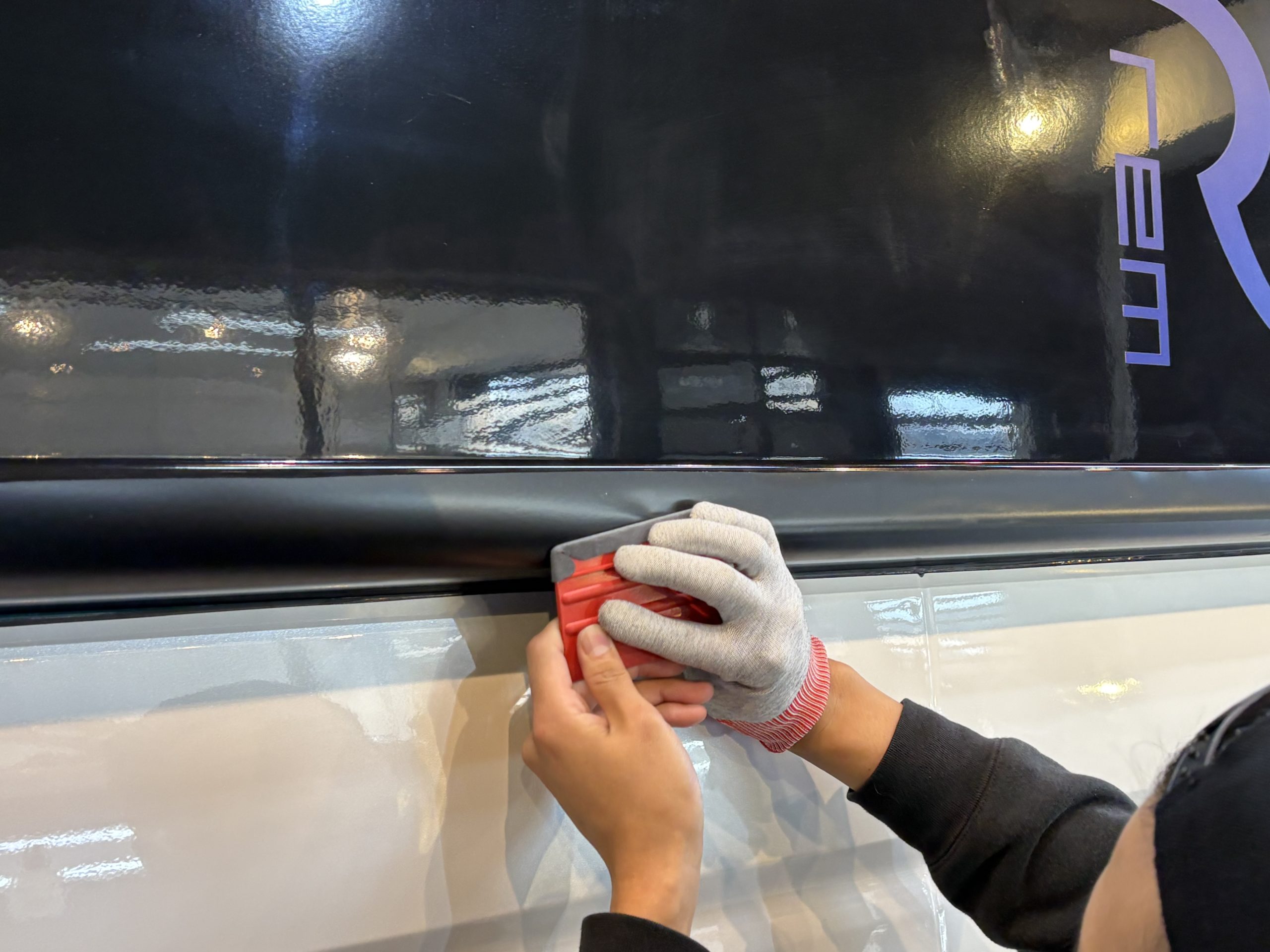 これほど大きくかつ局面の多い部品は一枚のラッピングフィルムによる施工は難しいため