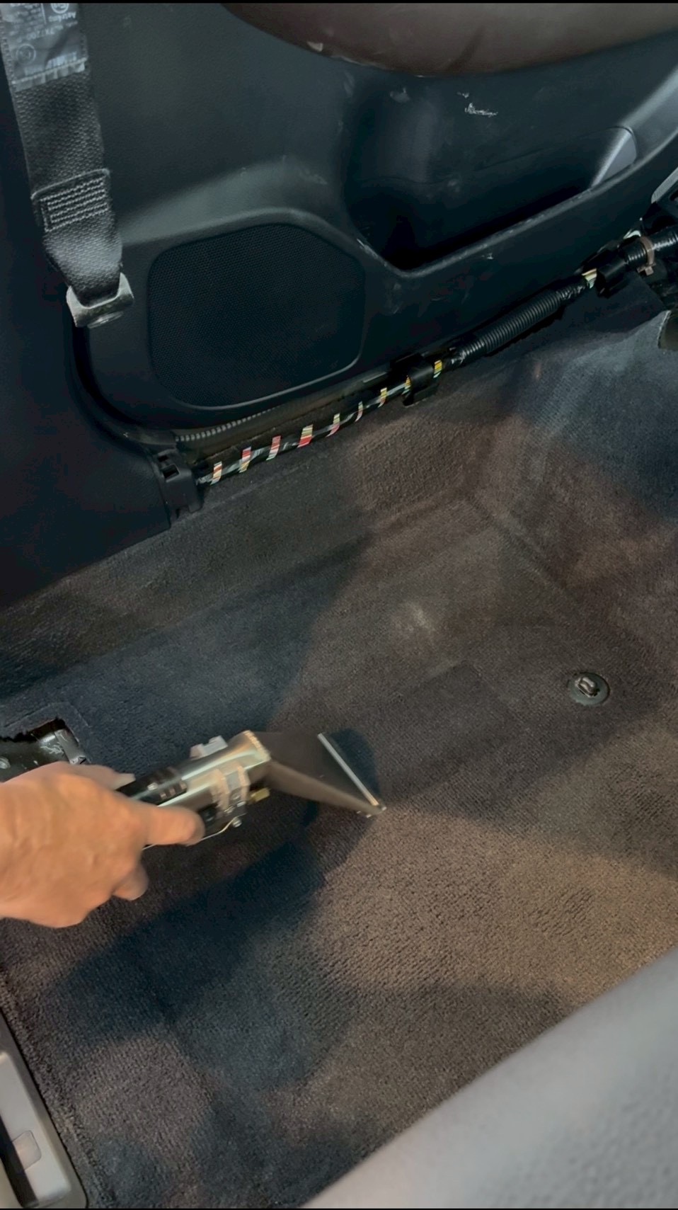 車内清掃でまずシートやマットのゴミを取り除いておき、その後水を吹きかけながらゆっくりとカーペット素材をなぞっていきます。
