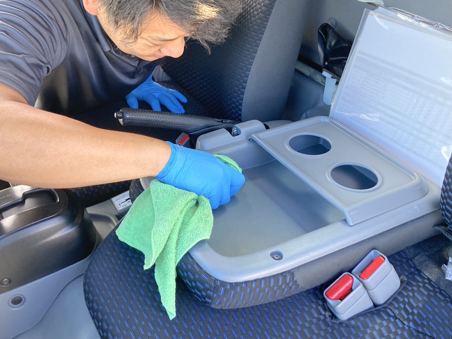 シート中央の小物入れスペースも汚れていましたので