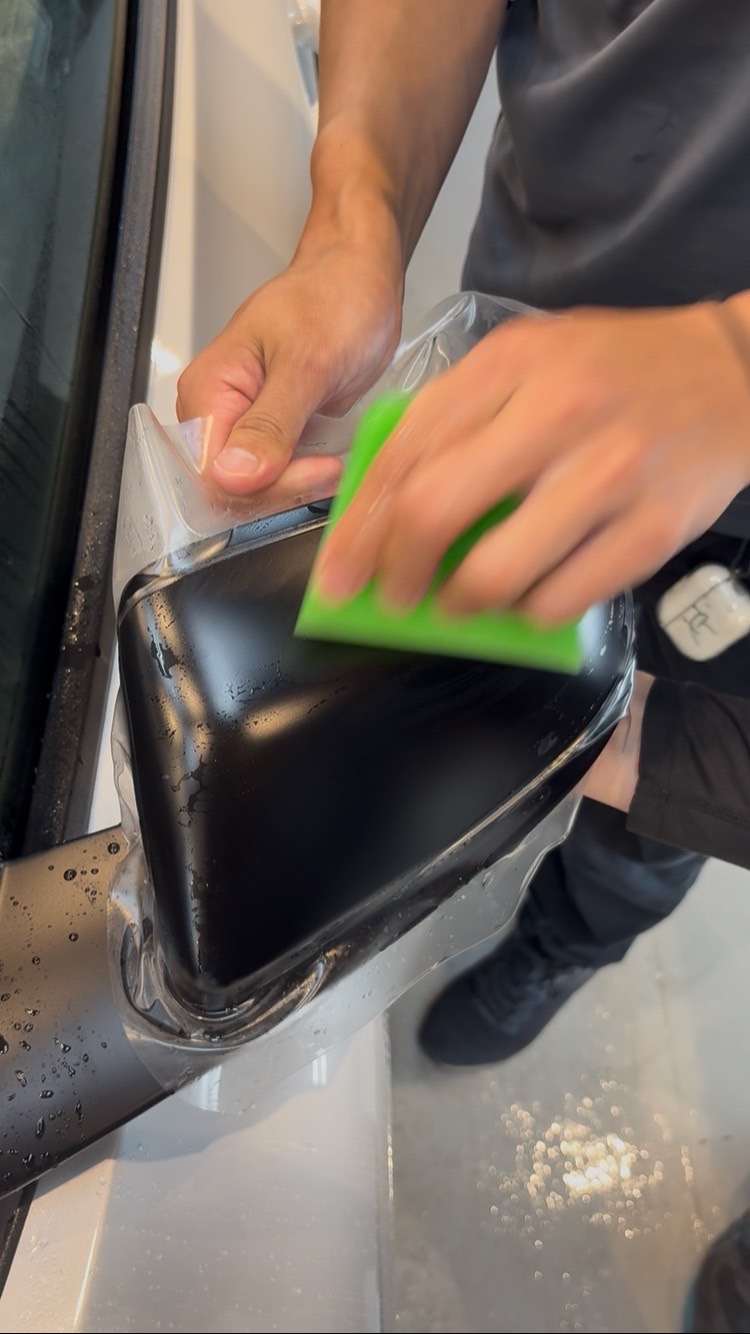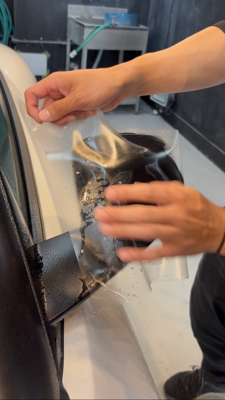 フィルムを伸ばして湾曲しているドアミラーカバーに沿わせて